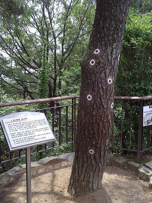 A crooked pine tree behind the Blue House still shows bullet holes from the Jan. 21, 1968, firefight. Officials preserved the tree as a memorial, leaving the damage visible as a reminder that North Korean forces are a constant danger to American and South Korean soldiers.