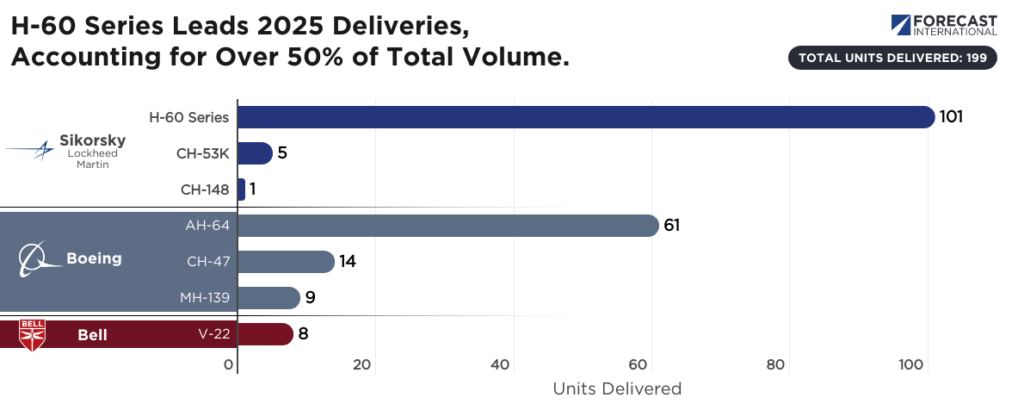 Sikorsky delivered the most in 2025, anchored by the H-60 line: a total of 101 Black Hawks and Seahawks. Boeing recorded the most growth, increasing annual deliveries by about 22 percent. Bell experienced the only decline among the three companies, delivering ten fewer aircraft in 2025 as AH-1Z exports taper and MV-22 Osprey production for the U.S. Navy and Marine Corps nears completion.